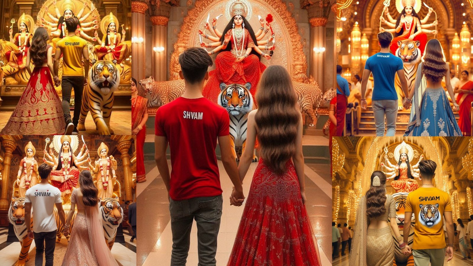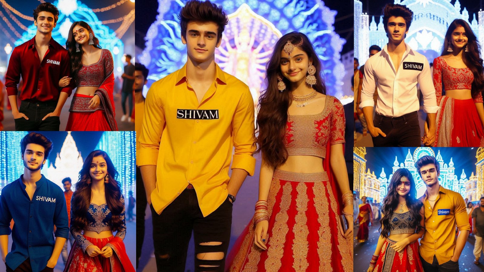 real 18 year old indian boy and a A girl are both walking boy is wearing a yellow Shirt with name “Shivam” is Clearly written on Shirt in clear letters and wearing black pant., the girl is are wearing looking beautiful red lehnga ,sweet, smiling, stylish hair.the background is beautiful blue light decoration in durga puja mela.full hd quality picture, 32k quality images