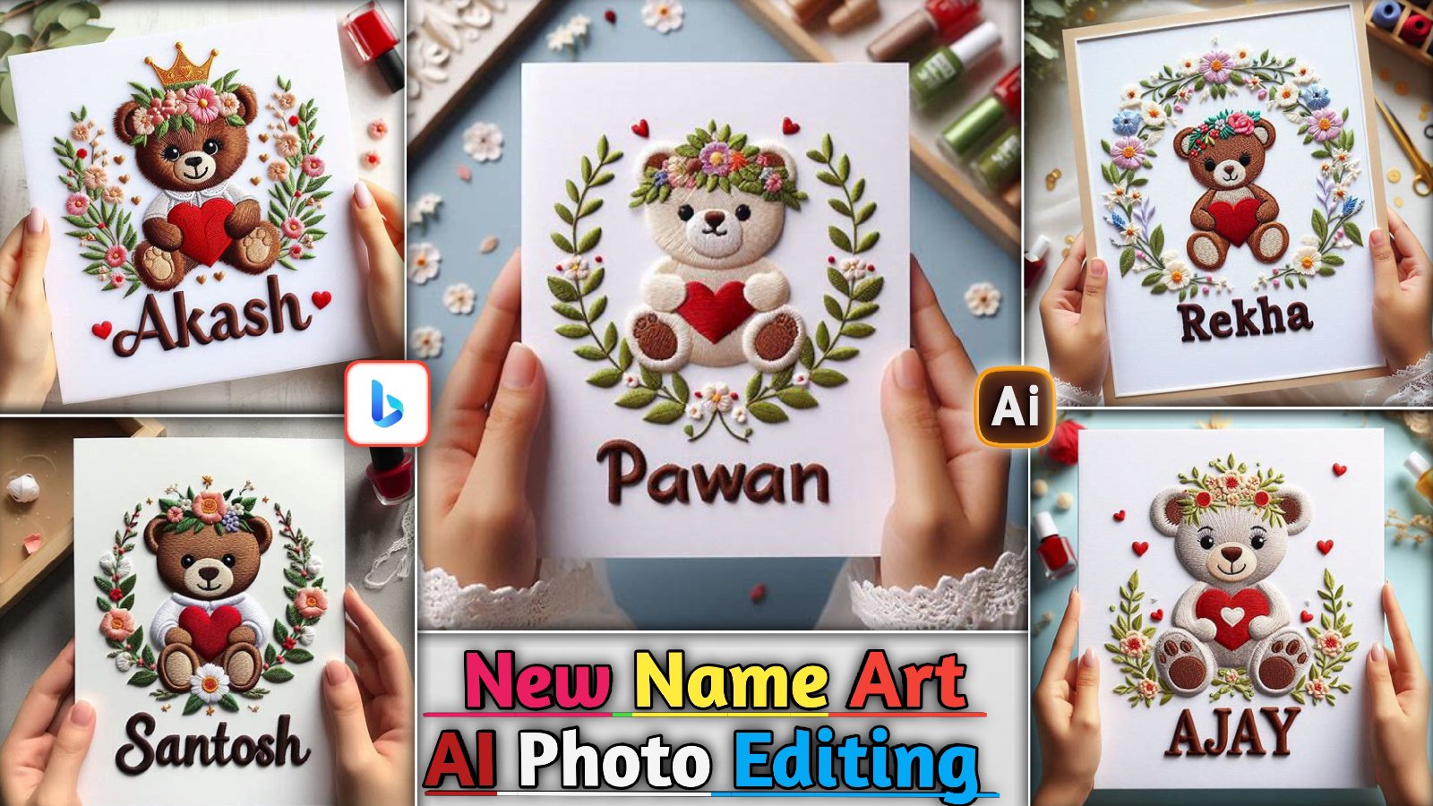The image showcases personalized name art featuring teddy bear designs holding hearts, surrounded by floral decorations. Each piece includes names like “PAWAN”with variations in bear and flower styles. The text promotes “New Name Art” created or enhanced using AI photo editing tools. The layout is a collage, displaying multiple designs with a handcrafted or embroidered […]