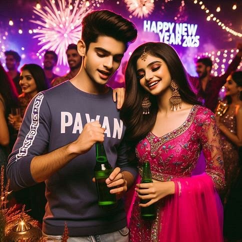“A 16 year Indian couple celebrating New Year’s Eve surrounded by a joyful crowd enjoying the party. The boy, wearing a sleeve t-shirt the name ‘PAWAN,’ is opening a beer bottle, and beside him stands a girl is wearing a pink vibrant lehenga . both are looking so cute, smiles, stylish hair.The background features a ‘Happy New Year 2025’ banner, festive lights, and fireworks in the night sky. Celebrating party around them creating a vibrant, lively atmosphere .