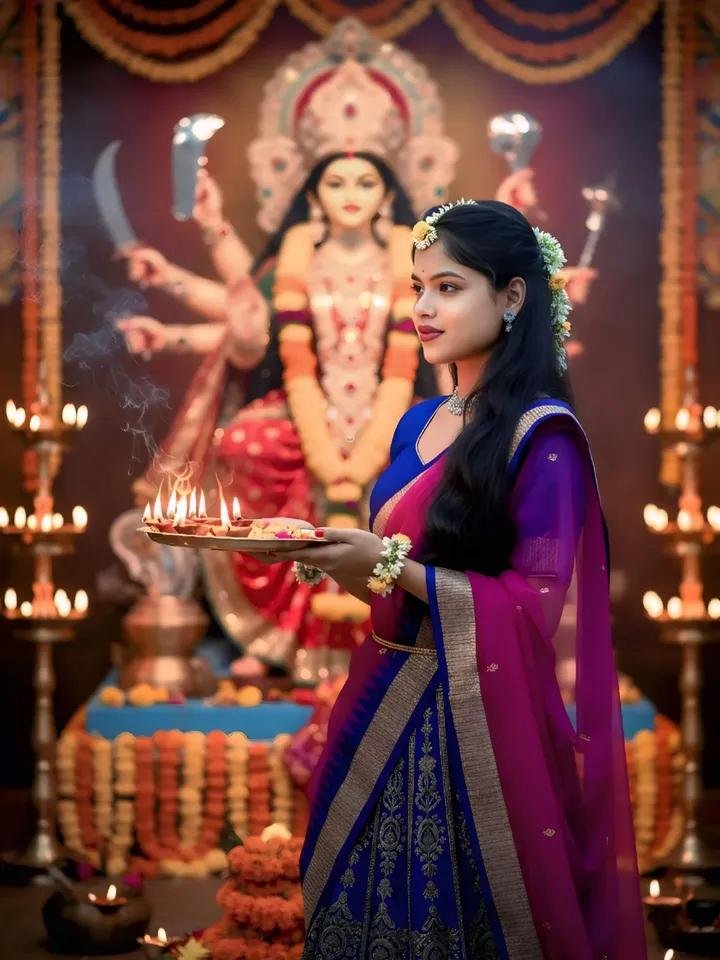 Durga Navratri celebration scene, a young Indian girl wearing a bright traditional lehenga and dupatta, standing in front of a decorated Durga Maa idol, offering puja with aarti thali in hand. Warm golden lamps and marigold garlands all around, incense smoke drifting in soft light. Cinematic background with vibrant festive colors, shallow depth of field, soft bokeh lights, piklu ‘ultra-realistic photography, 9:16 vertical composition.”