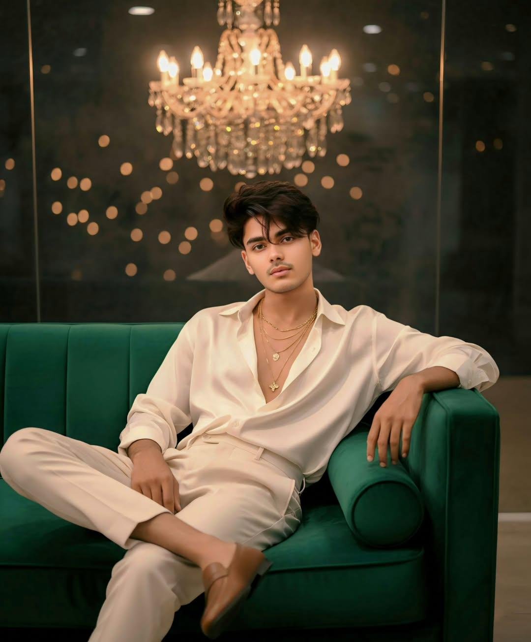 8k Ultra-realistic Ultra-realistiC high-fashion editorial, young man with messy hair over the eye (reference face), lounging casually on a luxurious velvet sofa in a modern studio. Wearing silk ivory shirt half-open with layered necklaces, paired with cream tailored pants. Soft golden light and blurred chandelier glow in background. Elegant, classy, trending editorial. face white