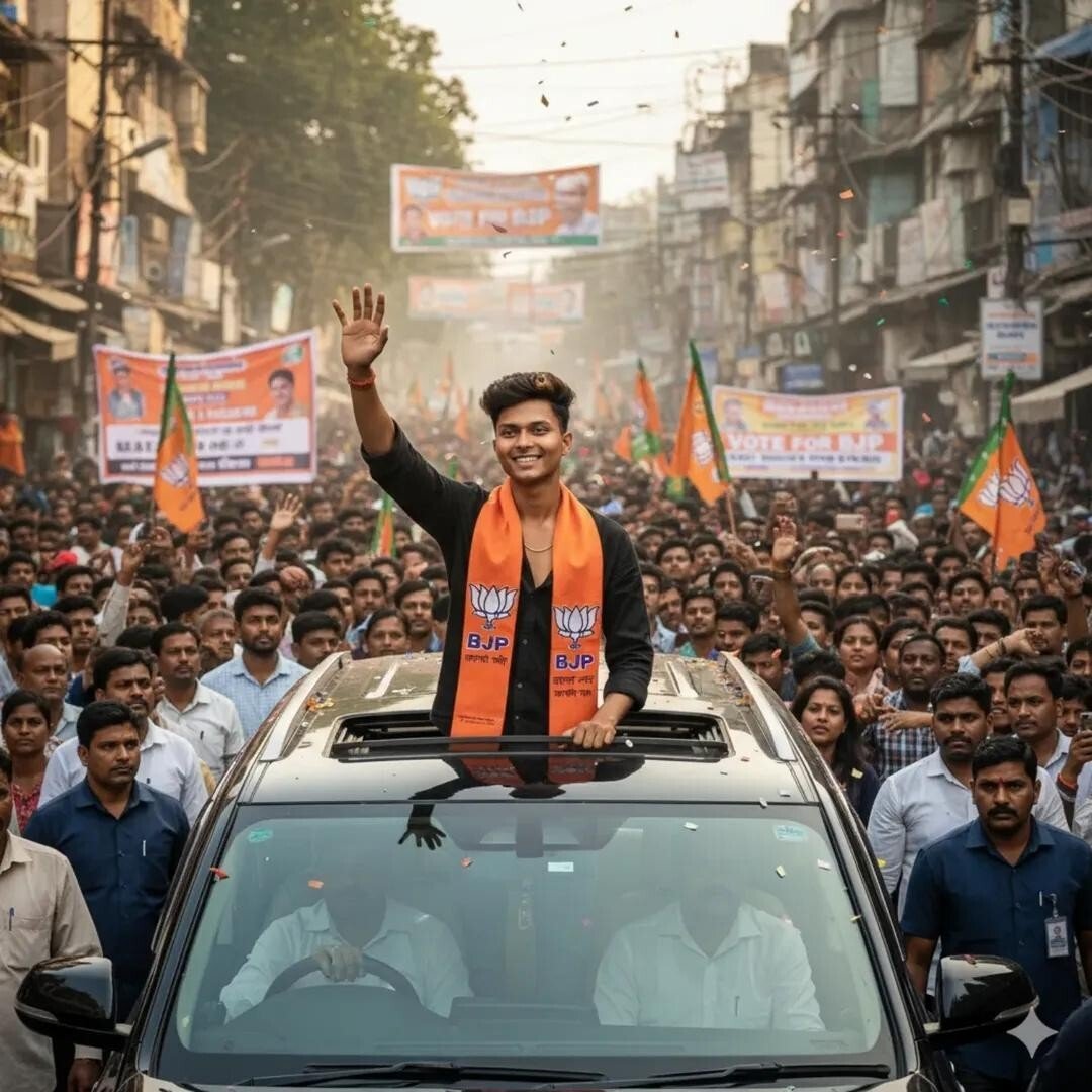 A CHARISMATICs ADD TWO MAN POLITICAL LEADER WEARINGA ORENGE BJP PARTY SCARF, LOUTS LOGO STANDING IN TWO MAN THROUGH A SUNROOF OF A BLACK SÚV, WAVING TO A LARGE CHEERING CROWD DURING A CAMPAIGN RALLY ON A BUSY STREET IN INDIA, WITH PARTY FLAGS AND BANNERS VISIBLE, DAYTIME AND ENERGETIC ATMOSPHERE.”KEEP MY FACE 100% SAME AS IN THE uploded IMAGE.