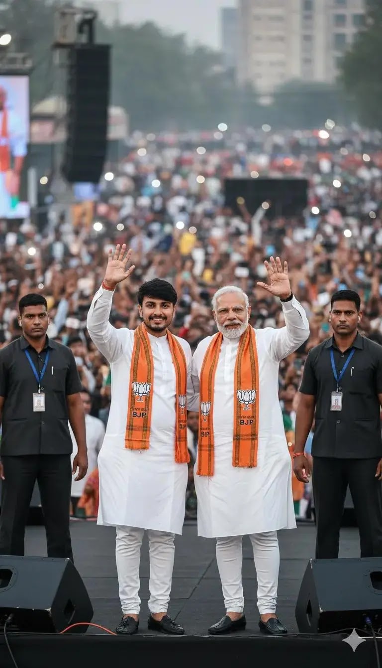 A young man (The person face , Hairstyle is 100% original, exactly matching the uploaded above reference photo’s , no Al beautification or alterations ) of Indian BJP party politician wearing a white kurta and a BJP ‘gamcha’ (scarf) with no flower mala, standing on a stage next to Narendra Modi, both waving to a blurred crowd. Two razor-sharp security guards are positioned beside them. The background features a blurred media crowd, city bokeh,and high quality 8k