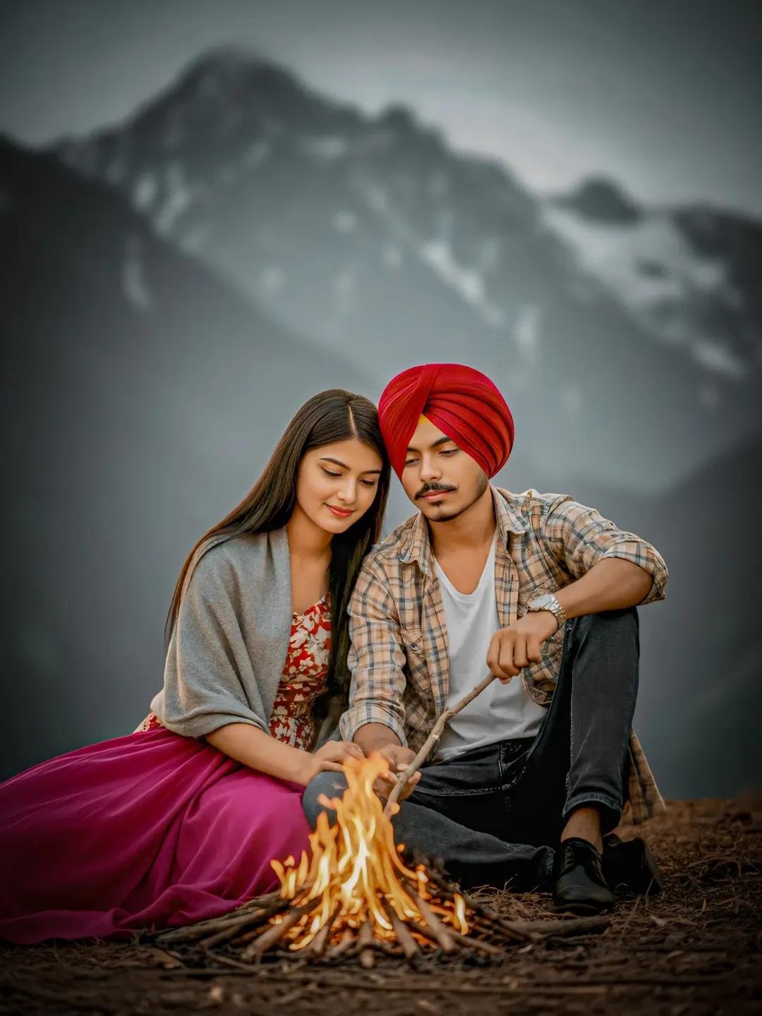 Ultra-realistic cinematic DSLR-style photo of a young couple sitting together outdoors on natural ground, in front of a small campfire. The young man (5’7″, slim-fit body, same face and hairstyle as reference, black hair) is wearing a white t-shirt layered with a light checkered shirt and dark pants. The young woman (slim body, long straight black hair) is wearing a floral red-and-white dress with a shawl draped around her shoulders. Pose & Expression: The man is gently holding a stick near the fire while looking at it with a calm, focused expression. The woman sits close beside him, slightly leaning towards him, looking at him with a soft affectionate smile. Their expressions exactly match the reference- natural, relaxed, romantic. Camera Setup: full frame, full body visible, no crop, balanced cinematic framing