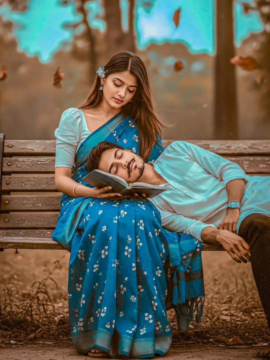 Create a retro, vintage-inspired image -grainy yet bright – based on the reference picture. The girl should be draped in a perfect blue cotton saree with small white flower prints, paired with a white blouse with sleeves, styled in a Pinterest- inspired aesthetic and the guy should wear a white kurta. The vibe must capture the essence ofa 90s novie dark-brown-haired baddie, with silky hair and a smalI flower tucked visibly into her hair, enhanced by a windy, romantic atmosphere. She is sitting on a wooden bench as a few leaves blow in the air, while dramatic contrasts add mystery and artistry to the scene, creating a moody yet enchanting cinematic effect. Her pose should suggest that she is reading a book and the guys pose should be lying in her lap looking keep subject face 100% perfectly the boy sleeping on bench perfectly