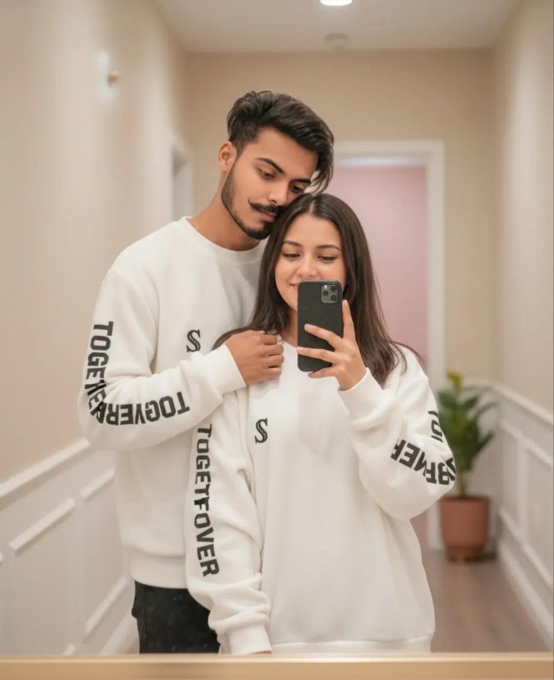 A young couple is taking a mirror selfie in a softly lit hallway. Both are wearing matching oversized white sweatshirts with black text printed on the sleeves. The girl is holding the phone with one hand, Smiling gently, while the boy stands behind her with his wrapped, around her shoulders, resting his chin near her head. The atmosphere feels cozy, warm, and affectionate, highlighting their bond and matching outfits in: minimalist, pastel- toned setting. Maintain the man’s exact facial features. Keep subject face 100% perfectly