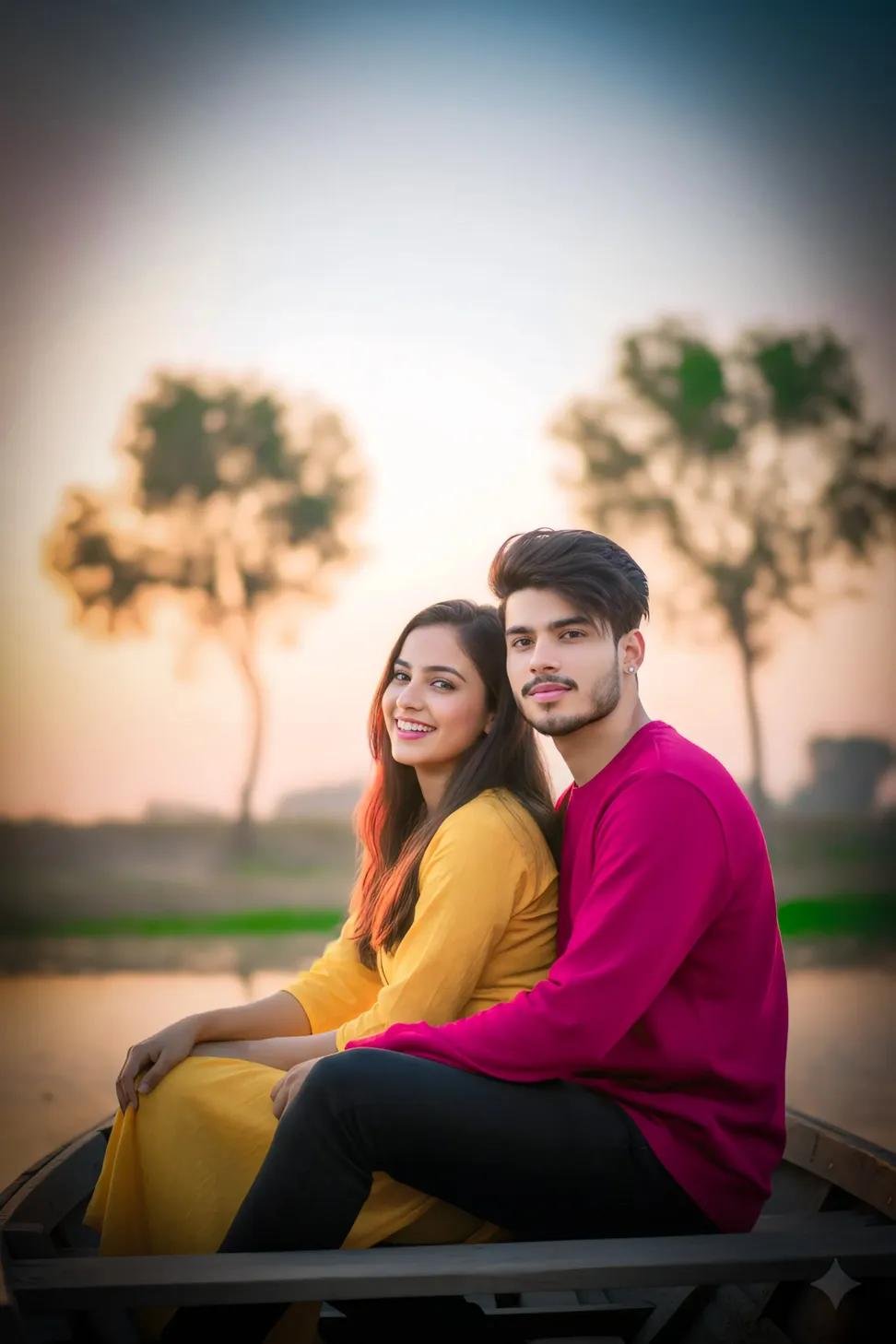 A young couple sitting closely together in what appears to be a boat or by the water’s edge, with a bright sky and some trees in the background. The woman is in the foreground, looking to her left and smiling, wearing a yellow outfit. The man is behind her, looking towards the camera, wearing a red top. The lighting suggests either sunrise or sunset.