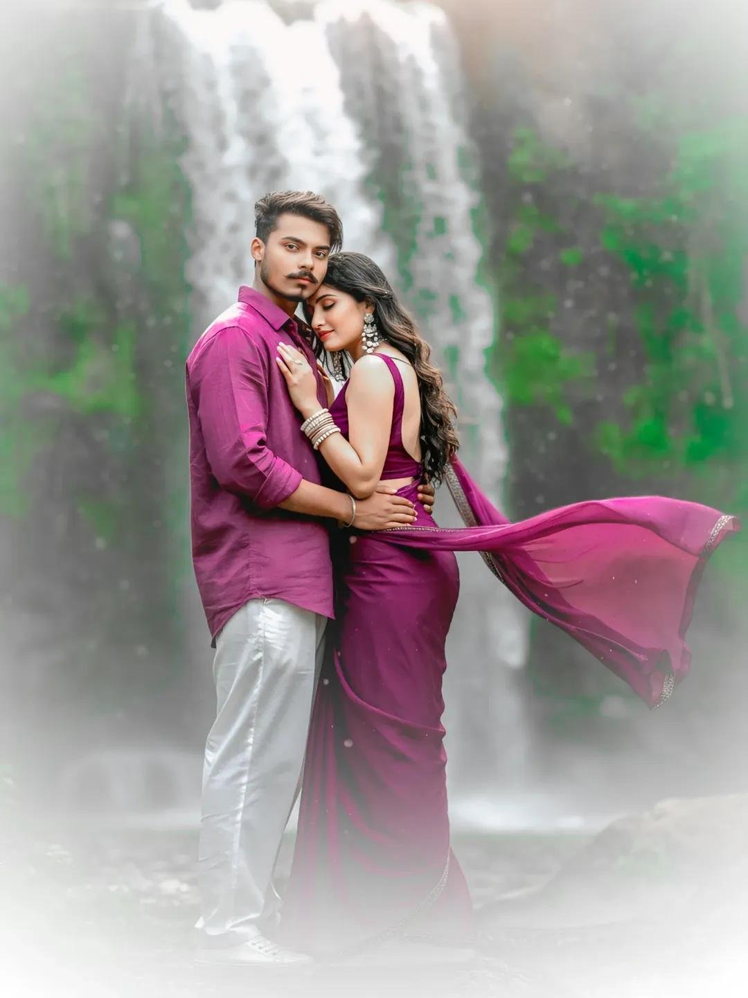 A romantic pre-wedding photoshoot at a beautiful waterfall. The girl is wearing a deep purple chiffon saree with a sleeveless, backless purple blouse. She is adorned with elegant pearl jewelry, including pearl bangles on her hands. The saree’s pallu flows dramatically in the wind, adding movement to the scene. Her long, lightly curled hair is open and cascading naturally. Behind her, the boy stands close, wearing a purple shirt with oversized white baggy He gently holds her from the back as she rests her head tenderly against his chest. The waterfall creates a dreamy, romantic backdrop with misty droplets in the air, enhancing the magical atmosphere keep subject face 100% perfectly