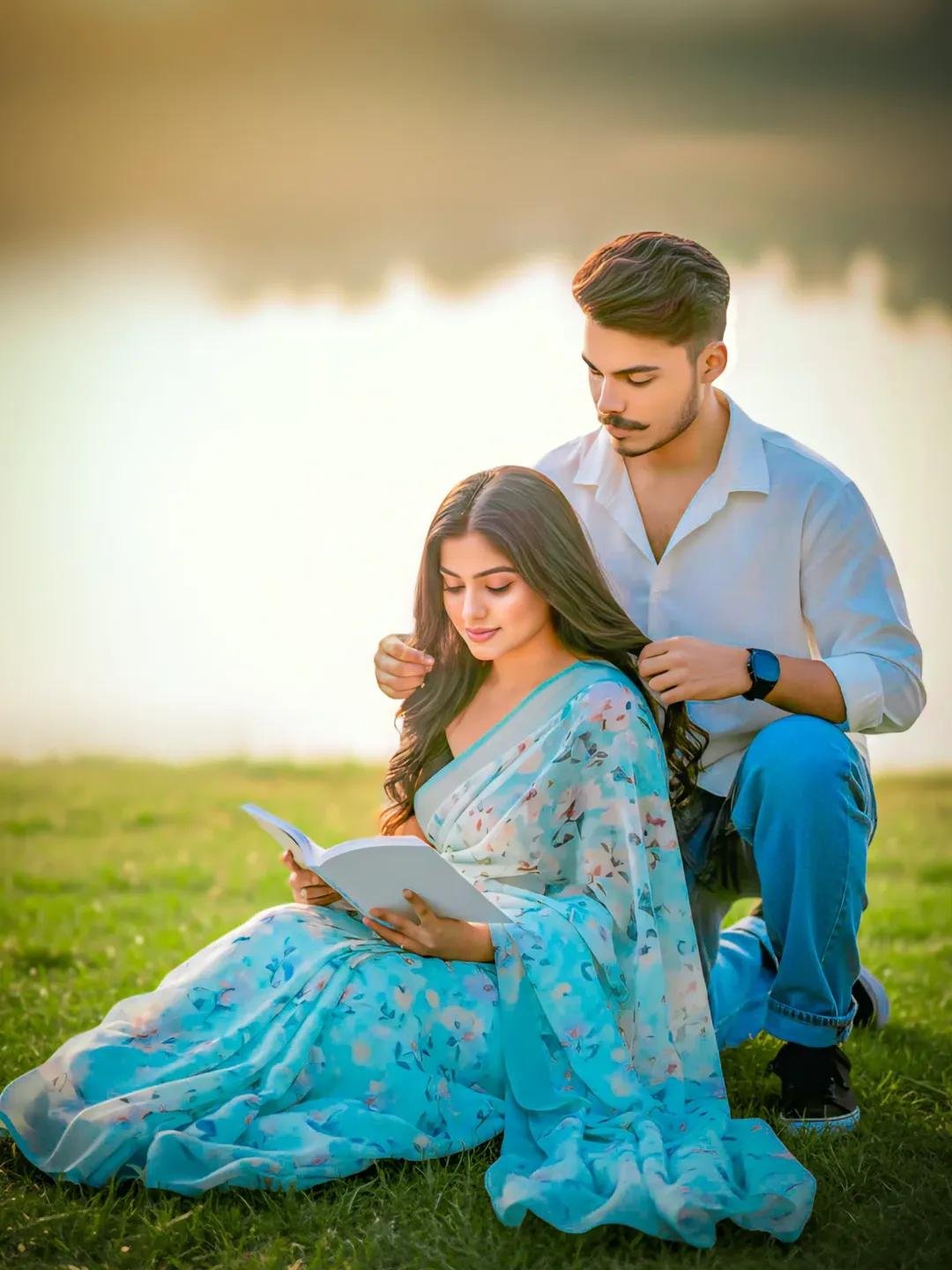 Hyperrealistic cinematic portrait** of a 18years old South Asian couple taken during the **golden hour**. The girl with dark hair, is seated on lush, vibrant green grass, wearing a flowing **pastel blue and teal printed saree** with a black blouse. She is absorbed in reading an open white book. The man, wearing a oversized bagEy jeans and white shirt is kneeling directly behind her, **gently weaving or braiding a section of her hair**. They are situated by the edge of a **still keep subject face 100% perfectly