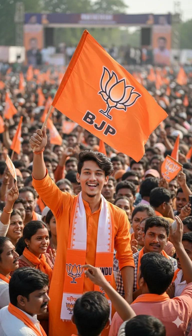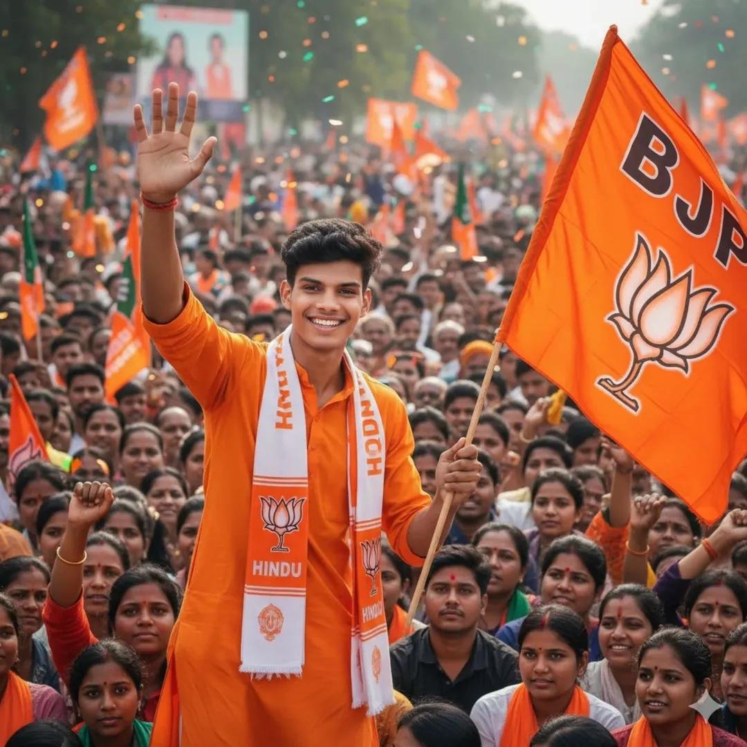 Create a hyper realistic 8k Whose face matches 100% with the reference photo provided. His body is slim and proportionate (not bulky or wide). He is smiling and waving in a massive, energetic crowd at a political rally. He holds a bright safron HINDI flag that has the word ‘BJP’ written in white along with a clear glowing hanuman symbol printed on it. He wears a safron colour kurta and a safron-on-white scarf featuring the same Hanuman symbol and ‘HINDU’ text. The crowd is waving.