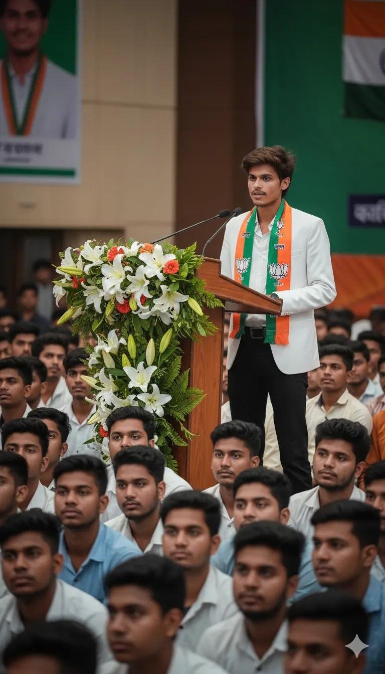 Ultra-realistic 8K cinematic photograph of the same young man (exact face and perfectly styled hairstyle as in the uploaded image), standing confidently behind a podium decorated with fresh white lilies, addressing an attentive crowd of young men whose full focus is on him. He is wearing a crisp white shirt, black suit, and black trousers, with a neatly draped BJP gamcha (orange and green scarf with the party symbol) around his neck.