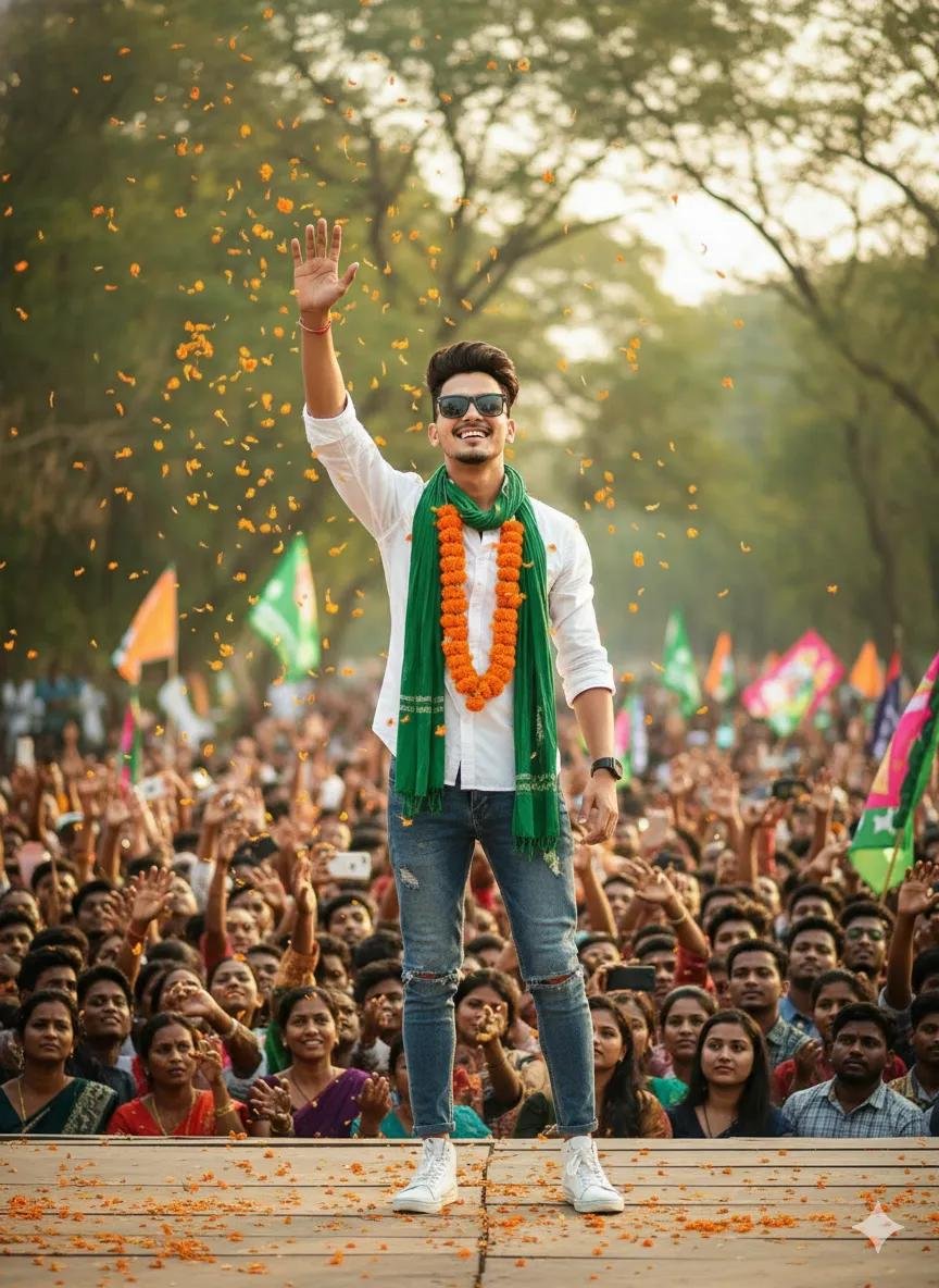 A full-body shot of a person, [Diwakar/Description of Person], standing on an elevated platform, waving to a large crowd. They are surrounded by falling orange flower petals, and wearing a white shirt, blue jeans, and a green scarf with an orange flower garland around their neck. The setting is outdoors with greenery in the background, resembling a political rally or festive parade. The atmosphere is energetic and celebratory