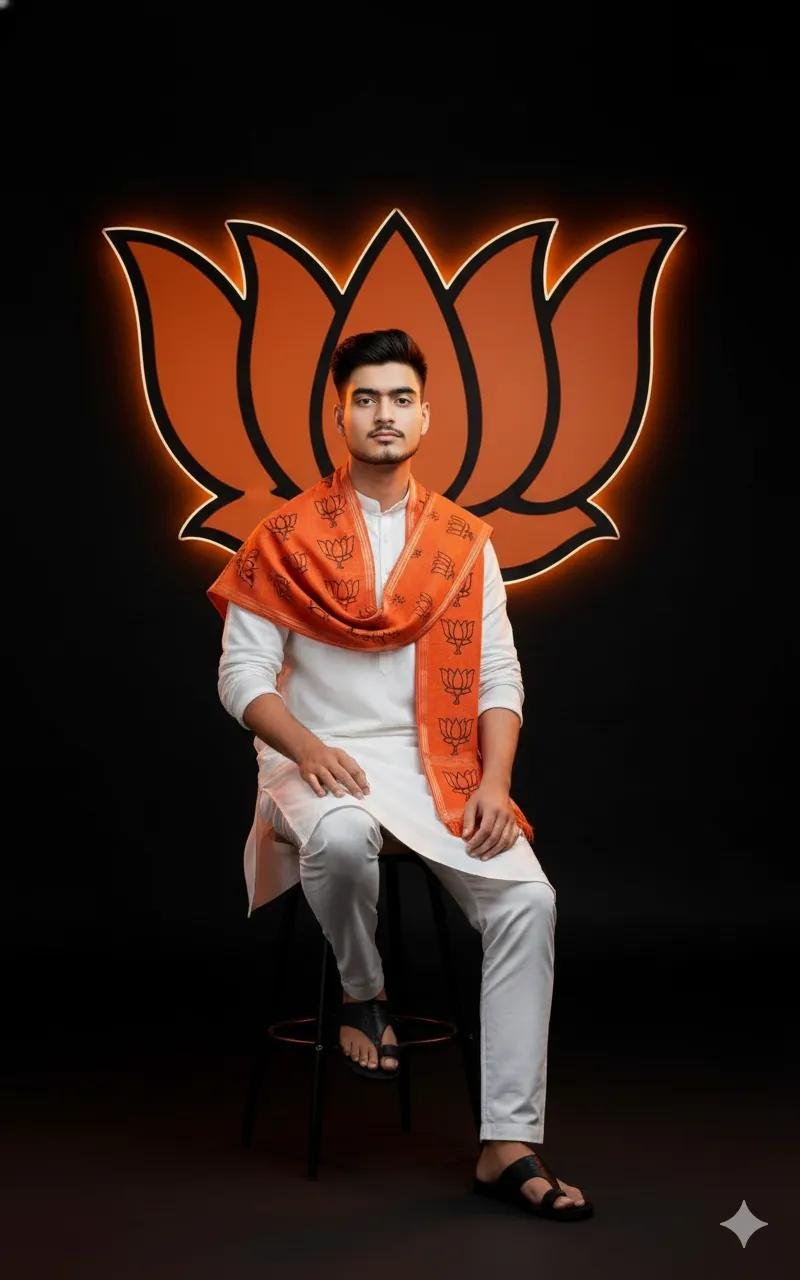 Ultra-photorealistic studio portrait of a man (same face and hairstyle as same in image) sitting on a classy tool, with glowing orange lights. Black background with bold orange 3D BJP Symbol behind him, styled like a fashion poster. He wears a white kurta and and white pajamas with orange BJP khesh with symbols and black chapal, Realistic skin texture, soft studio lighting, sharp details.