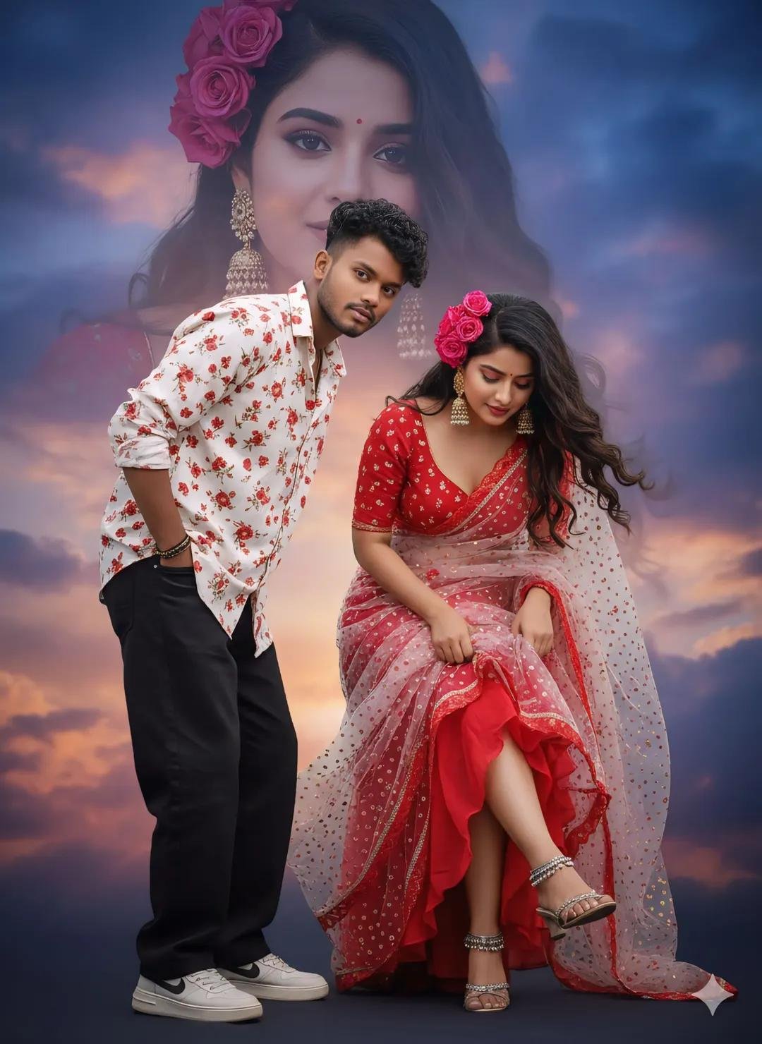 Cinematic Bollywood couple poster: young man & woman slightly bending. gently lifting her red-white net saree, eledant pose, openflowing har withrani gulabị roses, long ibuaka earrings, payal 0Dfeet ye focus on feet, Backorond sky with her glowngcbse up face, dreany cinematic lighting, vibrant colors, soft haze, high detall, glamorous Bolly wo0d style.”6Kman dress, Red flowers On a white shirt.light balck repaid jenes.big sneakers. Soheal