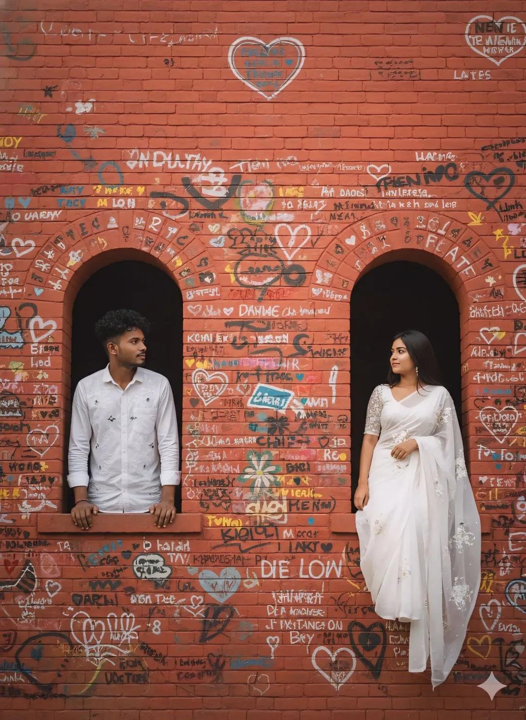 Convert the above image into ultra realistic portrait of both M LO should be looking at each Ecother in a seperate window opening in a red plain building wall with many doodles romantic and love art.both の should be in seperate openings and looking out and looking at each other romantically.guy should wear white with white flowers shirt .girl should wear white with white flowers saree long distance side view of wall (D LOW not change the faces