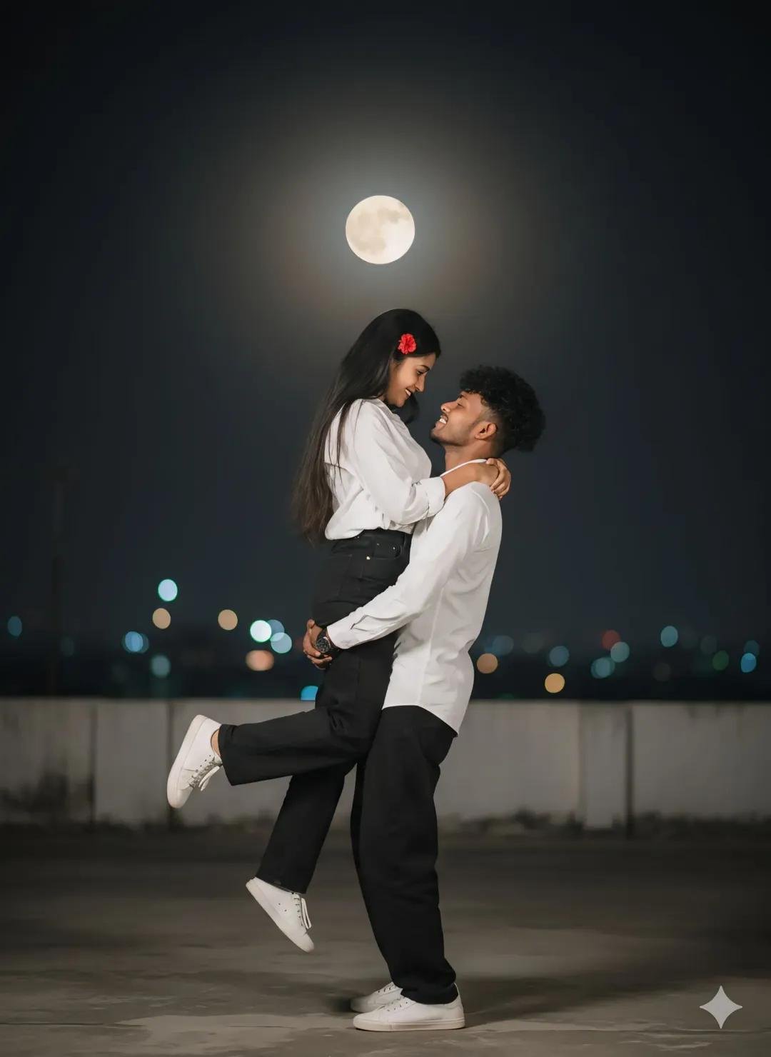 Hyper realistic portrait full body (both face 100% same as reference) of a young cOuples, Long hair in a loose bun with yellow claw clip, soft makeup, red lips, nike sneakers. Together in romnantic very close in soft smiles standing against night with direct flash creating a soft diffused glow and light skin reflection. Cool bluish tone, slight grain, sexy gaze, cinematic editorial 8K look. my image generate don’t change face, boy shirt pink sitara girl fancy Saree redboy girl hug back side
