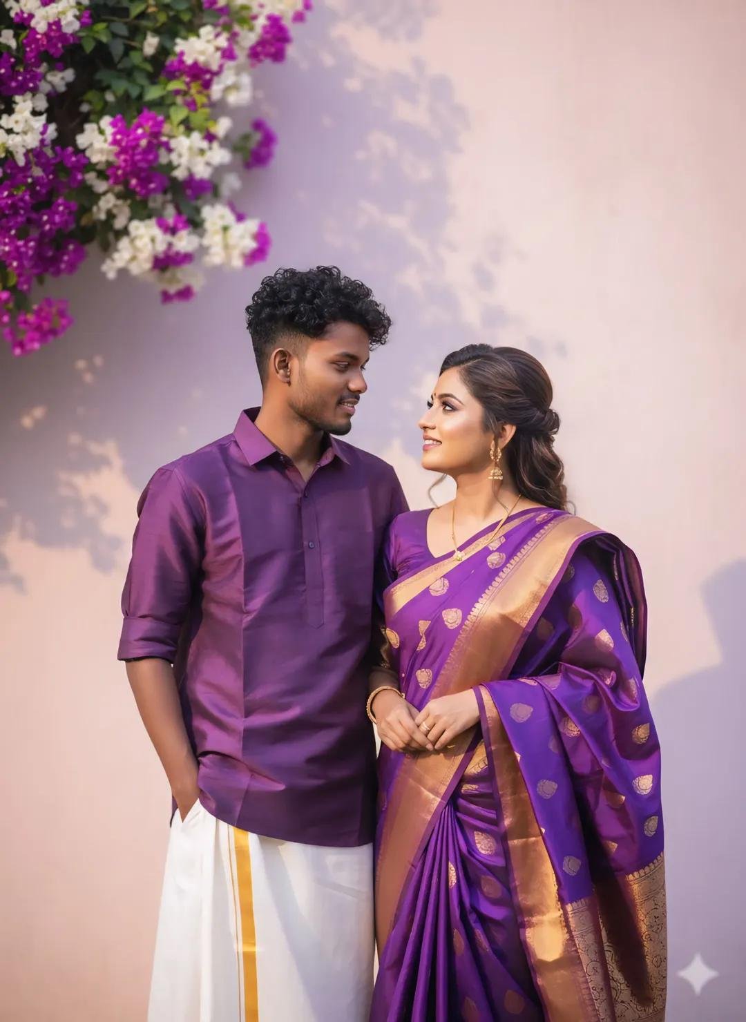 Convert the above image into ultra realistic portrait of both should be in a romantic pose in front of plain wall in outdoor.guy should wear purple silk half sleeve shirt and white veshti .girl should wear purple silk saree with golden borders.girl should be in elegant makeup and stylish hairstyle both should not look the camera.there should be sunlight fall on their faces .there should be purple with white flowers in left top in background .purple tone. (do not change the faces)