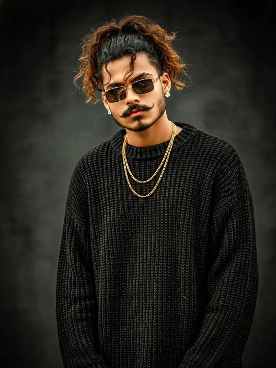 Artistic fashion portrait of a young boy in a oversized thick knit black sweater with thick textured yarn. He has ponytail long curry hair style and some.falling across to the face White diamond earrings, golden chain necklace, lighting, create a striking chiaroscuro effect. The overall ambient background is minimalist, somber, and elegant, rectangular sunglass, and he looks at cemara,,keep my face 100% perfectly