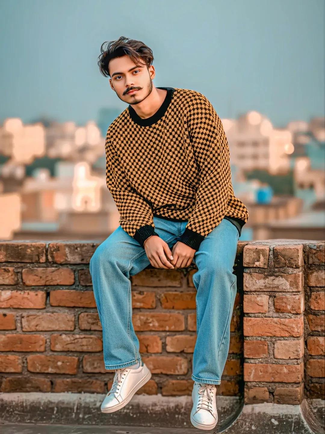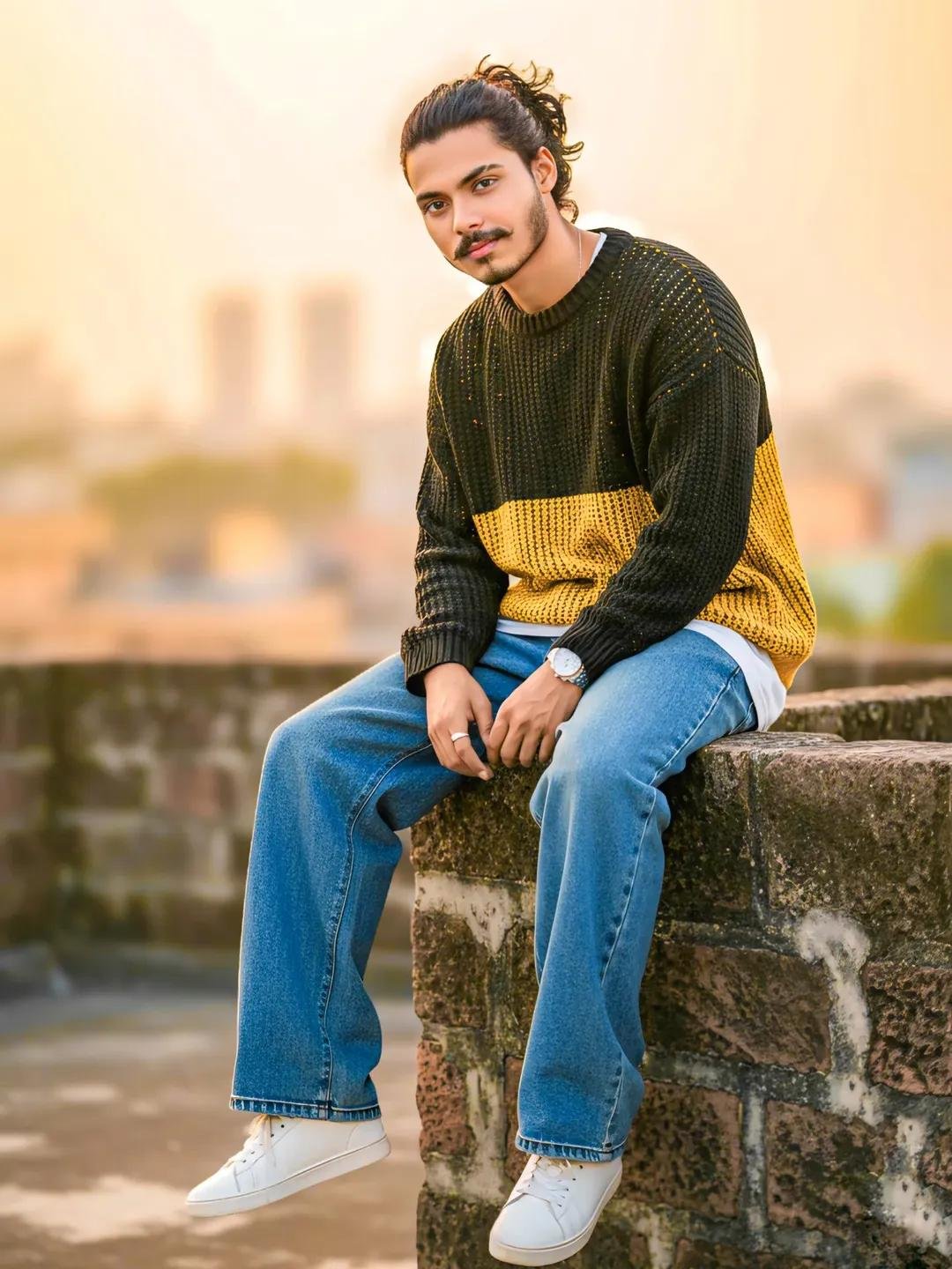 Create Professional Sony Alpha ultra realistic portrait of the uploaded boy on an Indian rooftop terrace, wearinga oversized baggy jeans with black and yellow oversized Sweater,, and white sneakers, and he has ponytail long curry hair style, fusion vibe. Pose: sitting on the parapet wal1, legs dangling. looking directly into the camera with a bold keep subject face 100% perfectly