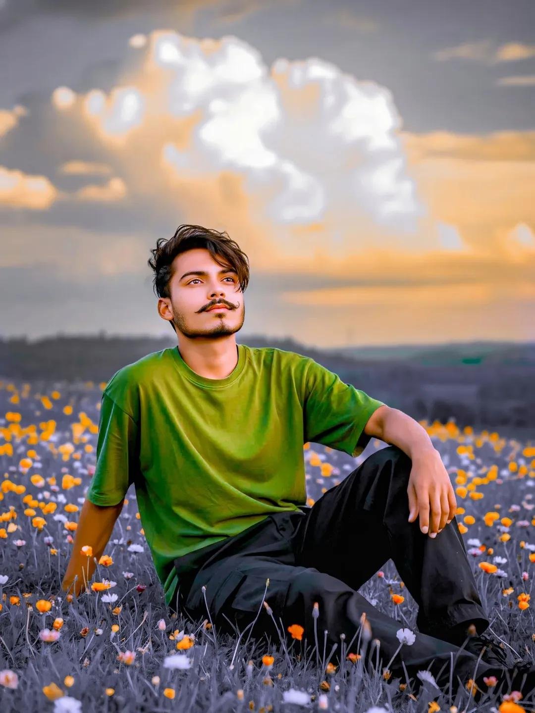 Portrait of a young man sitting on a green hillside, looking up at the sky. Wearing a loose T-shirt and dark oversized pants. In the background are giant cumulus clouds, impressive with a golden afternoon bottom. Foreground is filled with colorful wildflowers (orange, white, purple). Taken during the golden hour, the image is extremely detailed, with the man in sharp focus, shallow depth of field and high resolution. Don’t change the face Make messy hair keep subject face 100% perfectly