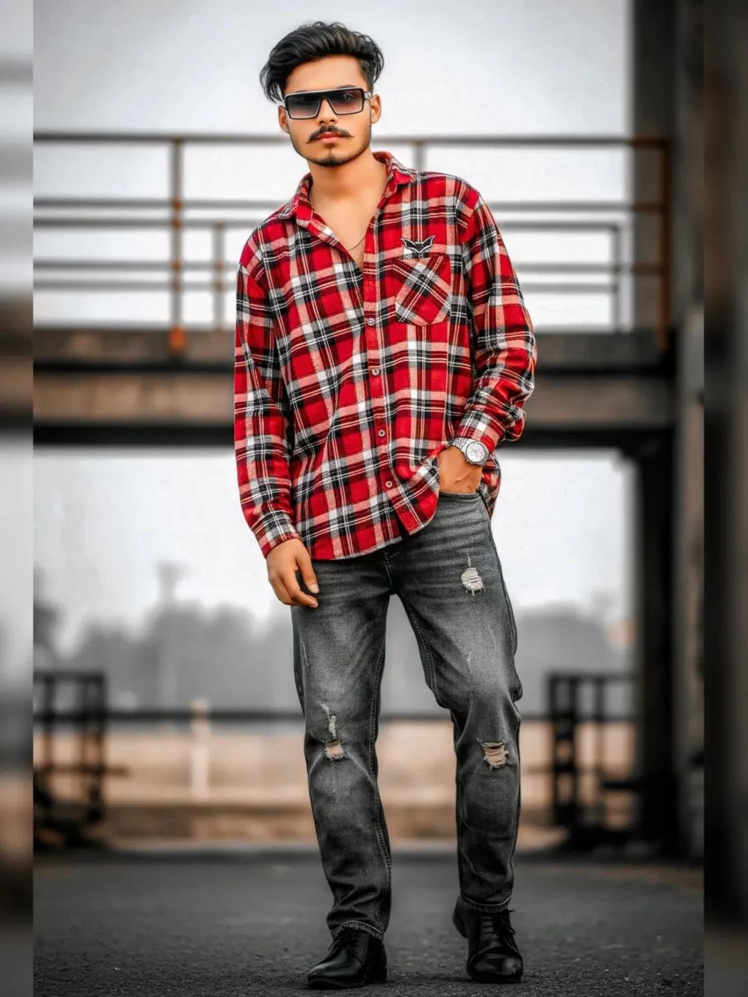 Ultra realistic stylish young boy with, messy hair, relaxing in a laid-back pose standing Wearing a oversized red black and white chek shirt a small bat logo on, and light Black damage jeans hands in pocket hand on leg and a rimless rectangular Gradient Black Sunglasses black and white framing, The background includes industrial railings and blurred outdoor elements, His face is turned sideways, (and partially obscured by his hand,) keep subject face 100% perfectly