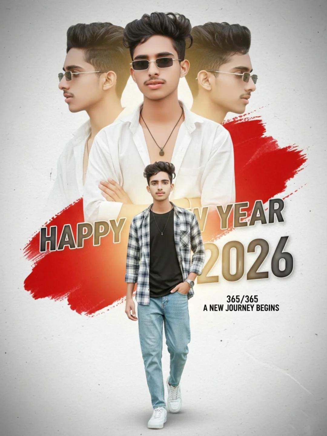 Cinematic HAPPY NEW YEAR 2026-poster collage of the same young man(face is perfectly Same as reference image), Confident casual vibe. Maîn 如-body fgure waling foward, one hand in pocket, jeans and checkered shirt with sports shoes, clean realistic ace texture, Large upper portrait in white shirt with sunglasses, relaxed pose, layered with two faded side profiles. White Papertexctured background with bold diagonal red paint-brush stroke, Subtle grain and soft vignette. Warm central glow