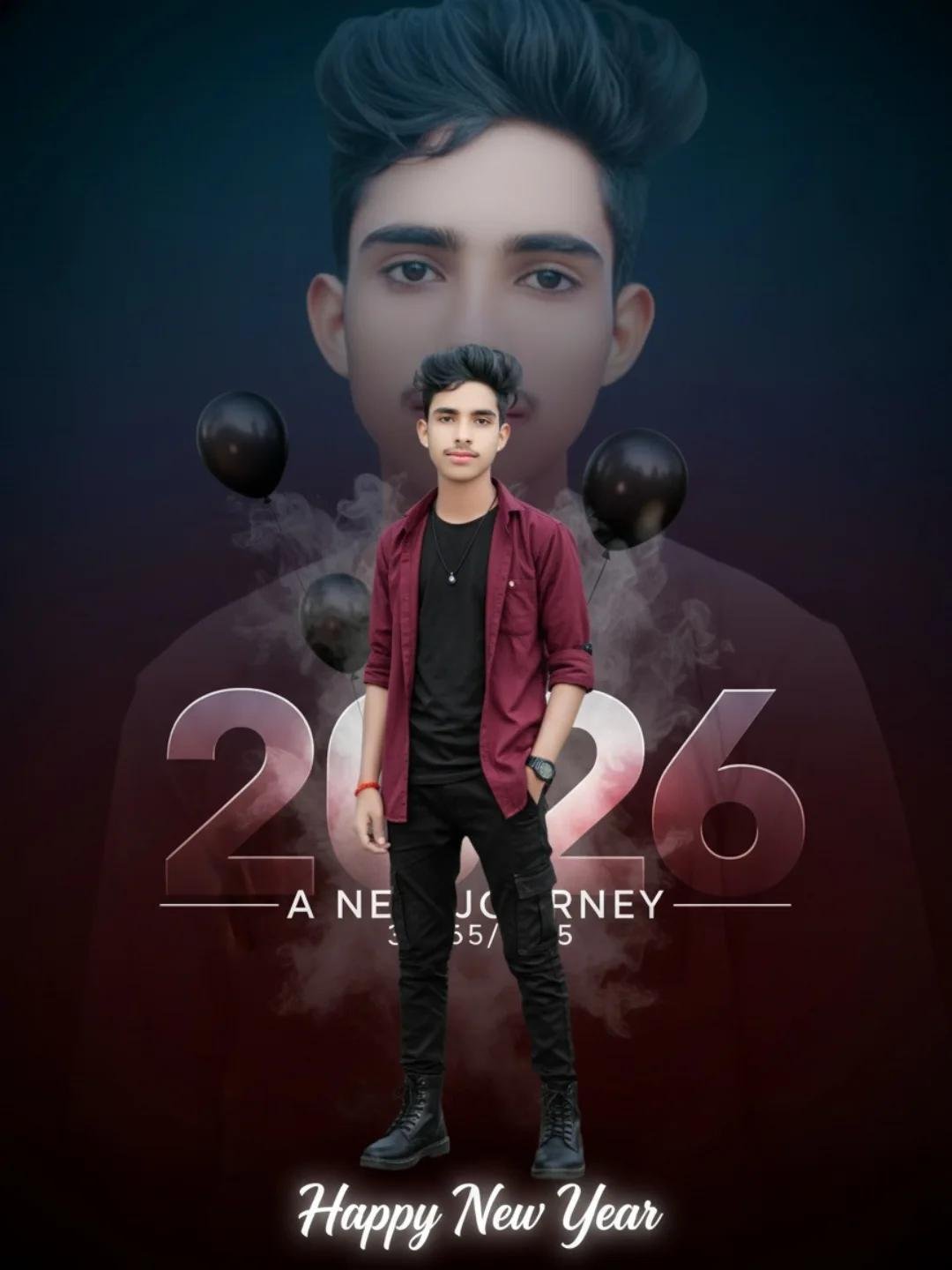 Make this photo Uploaded boy wearing a open marun shirt with black t shirt and carg0. The composition is double exposure style: a large, dominant portrait of the man in the background, with a smaller, full body version of him layered in the foreground. Dominant text in a modern, bold font “2026” with the subtitle “A NEW JOURNEY” and “365/365”. At the bottom, stylized, glowing cursive text says “HAPPY New Year”. Baground dark and lighting, flowing baluns, smoke behind his.