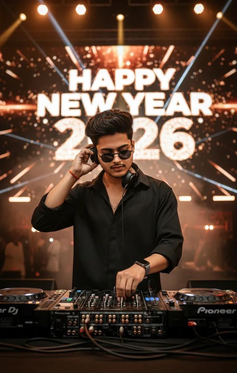 Ultra-realistic 8K cinematic DJ performance shot, hyper-detailed, photorealistic, professional live concert photography, shallow depth of field, HDR, ultra-sharp focus.A young stylish male DJ performing live on a massive New Year celebration stage with powerful stage presence; KEEP THE FACE EXACTLY THE SAME AS THE UPLOADED PHOTO – identical facial features, same hairstyle, same beard, same jawline, same skin texture, same sunglasses. DO NOT change, beautify