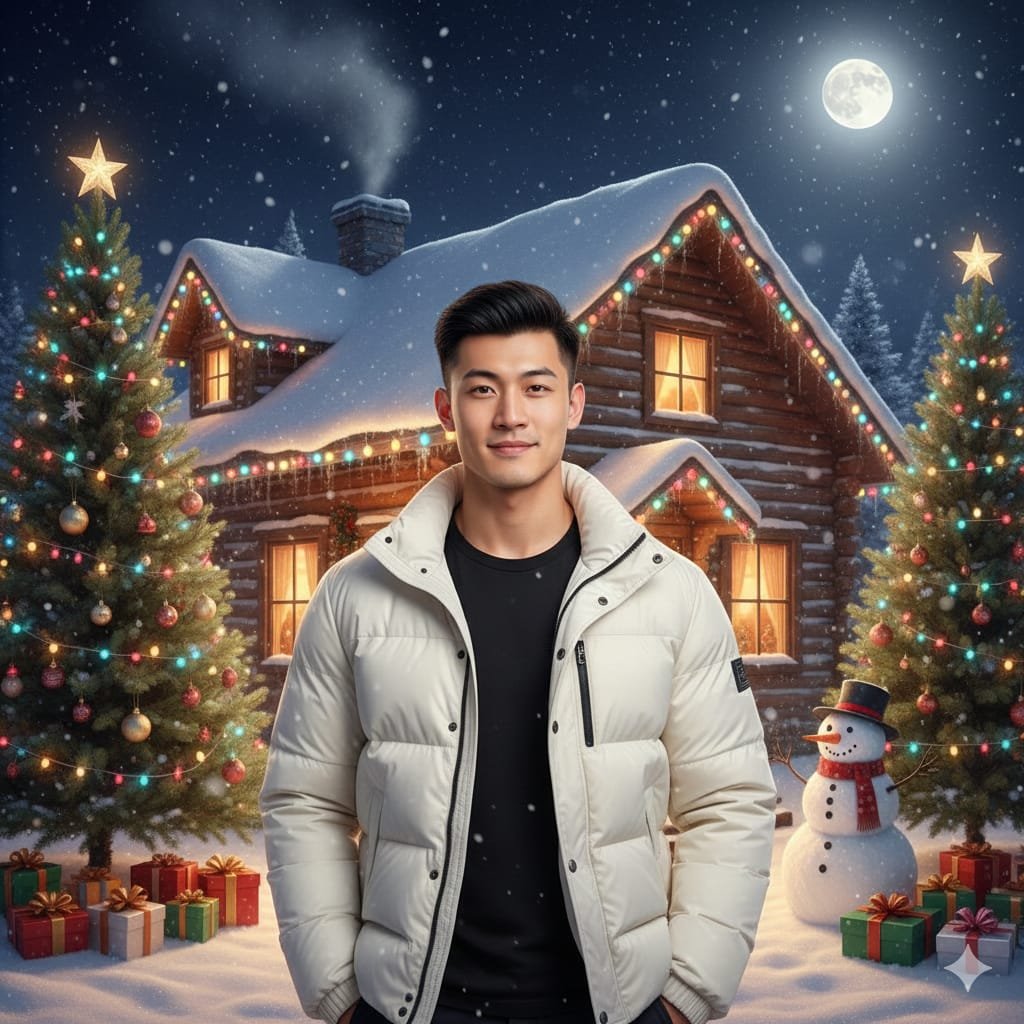 Create a picture of Merry Christmas with the face identical to the one we uploaded. Dress me in a stylish white winter jacket not blazer over a black T-shirt. Place me right in front of a house witha snowy cottage. I’m standing straight, holding my winter jacket with one hand and smiling slightly. There are green colour Christmas trees on either side. Colorful lights are shining on the Christmas tree. There’s also a snowman nearby. Place some gifts around me. There’sa light snowfall. There’s a shining moon, and the house is decorated with colorful light lights. Place some gifts next to my photo to make it look realistic. The snowfall effect is visible right in front of our photo. The Christmas tree should look complete