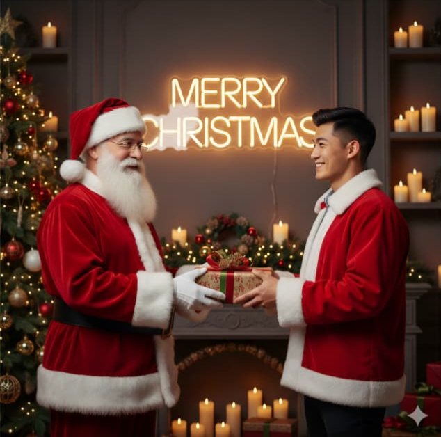 Use the uploaded photo as the ONLY face reference and keep the face EXACTLY the same (100% identityaccuracy).Scene:Warm luxury Christmas studio with fairy lights, candles, and a decorated Christmas tree.Bold glowin glowing “MERRY CHRISTMAS” text in the background, sharp and readable.LSanta Claus (CRITICAL):Santa Claus must be fully visible, crystal clear, andsharp.Classic red Santa suit with white fur trim, detailed beard and glasses.Santa must be in the same focus as the boy (no blur).Outfit:Boy wearing a red Santa-style winter jacket and dark pants, realistic fabric texture.Pose:Santa clearly handing a Christmas gift to the boy, both hands visible, natural interaction.Lighting & Quality:Soft warm lighting on both faces, natural skin texture.DSLR photo, 85mm lens, balanced depth of field.Ultra-realistic, 8K, HDR.Rules:Face identity must match exactly.Santa clarity is mandatory.”MERRY CHRISTMAS” text must be clear.No cartoon, no anime, no stylized output.