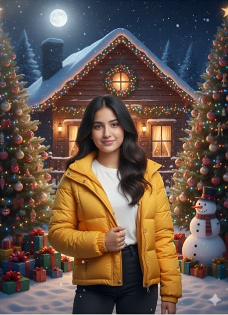 Ultra-realistic high-quality Christmas portrait of the same girl’s real face; first, a perfectly framed half-body mid-shot with the full bright yellow winter jacket visible and a little part of her pants; also, she wears a white t-shirt under the jacket and stands straight in a stylish confident pose holding the jacket with one hand; next, she looks straight into the camera with a soft sweet smile; meanwhile, snowy Christmas cottage with colorful lights in the background, shining moon in the night sky, and green Christmas trees lit on both sides; finally, add a snowman and colorful gift boxes for a lively, realistic scene.