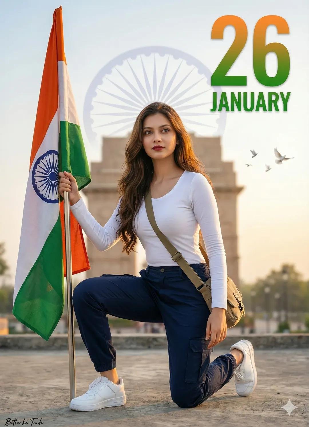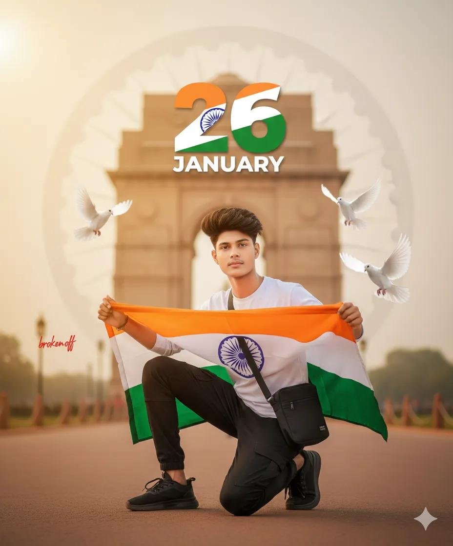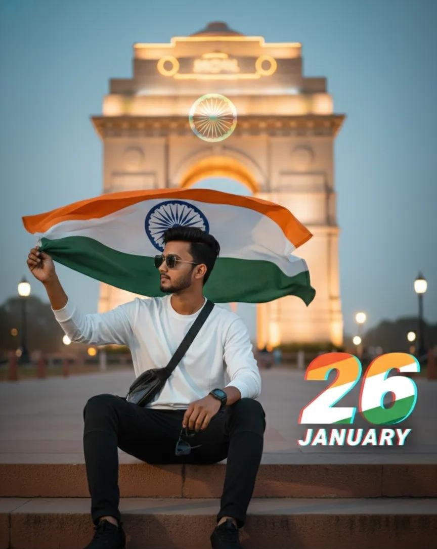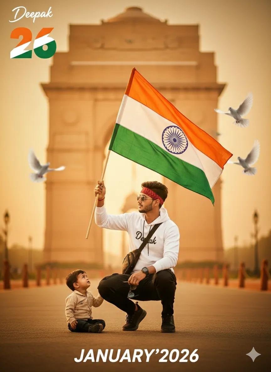 Ultra-realistic patriotic portrait of uploaded Indian boy crouching on one knee, holding the Indian tricolor flag. White long-sleeve T-shirt, black cargo, black sneakers, sling bag. India Gate and faded Ashoka Chakra in soft background, flying doves, warm golden-hour cinematic lighting, shallow depth of field, 8K DSLR quality. A small broken off signature in left corner, and large 26 number with three indian flag colour, ‘JANUARY’ in bottom with stylish font and blur.
