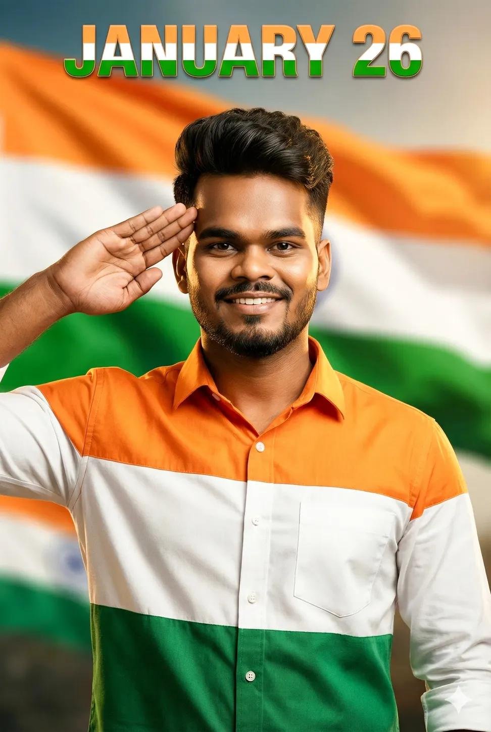 Ultra-realistic UHD/ DSLR-quality cinematic image ofa 25-year-old Indian man (use my uploaded photo for 100% exact face, skin tone & hair match – no changes at al) 一 Ai Prompt Shot Type: half-body cinematic shot Pose: salute pose, chest proud, eyes forward, strong patriotic smile Action: saluting the Indian Tiranga Flag Outfit: stylish tricolor shirt saffron (tiger color), white & green, clean modern fit Hair: stylish, well-groomed hero hairstyle Text Element: at the top of the image