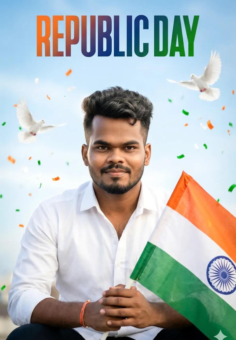 Ultra-realistic UHD/ DSLR-quality cinematic image of a 25-year-old Indian man (use my uploaded photo for 100% exact face, skin tone & hair match – no changesat all) —Ai Prompt Type: half-body cinematic shot (seated) Pose: sitting in a stylish pose, holding the Indian Tiranga flagin hand, calm soft smile look, eyes facing forward Outfit: clean white shirt, modern patriotic style Hair: stylish, neatly groomed hero hairstyle Text Element: at the top of the background written clearly- “REPUBLIC DAY” (bold cinematic patriotic font) Background: open sky theme, soft blue tones White doves flying in the sky (peace & freedom vibe) • Stylish tricolor flag particles falling (saffron, white & green) • Light cinematic motion blur for depth Lighting: professional DSLR lighting, soft natural daylight, gentle rim light Camera: shallow depth of field, sharp focus, cinematic framing Mood: proud, peaceful, confident Indian hero vibe Quality: ultra-realistic, UHD, high detail.