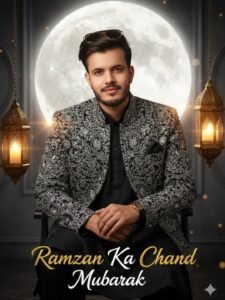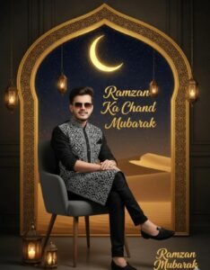 se-up to medium shot of a hands ome Sou如Asian man with a subtle s mile, wearing aviator sunglasses pus hed up on his head, a black and silve theavily embroidered sherwani jacke tover a black kurta, seated leaning s lightly forward with hands clasped el egantly. Eye-level camera angle for d irect, warm connection with the view er. A gigantic luminous full moon fills most of the background, framed per fectly behind him like a halo. Ornate golden Arabic lanterns hang in the fo reground on both sides, casting soft warm candlelight on his face and cr eating gentle lens flares. Dark luxurio us interior with textured grey walls. F estiye Ramadan atmosphere, soft bo keh lights, romantic and sophisticate dmood. Prominent elegant calligrap hy text overlay: 'Ramzan Ka Chand M ubarak' in gold and white across the lower part. Photorealistic, sharp faci al details, cinematic color grading with deep blacks and golden highlights do not change or edit my face