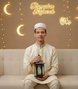 Ultra-realistic DSLR Ramadan portrait of young man sitting on sofa holding black lantern, wearing cream kurta with gold embroidery ard white prayer cap, gentle warm smile, glowing crescent moon décor, fairy lights and, Ramadan Kareem" Arabic calligraphyon beige wall, cozy festive ambience, mid-shot eye-level, sharp foçus, natural skin texture, cinematic warm lighting, 3:4 vertical, face 100% same as reference, no sunglasses, no beauty filter, no AI face change.