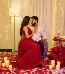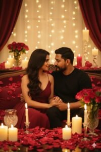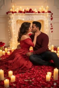 Bold romantic Valentine's Day-scene, a beautiful couple sitting closely together surrounded by red rose petals, candles, fairy lights, emotional passionate expressions, warm golden romantic glow, luxury Valentine décor, dreamy cinematic mood, respectful affectionate romance, ultra realistic, 8K, Gemini friendly,