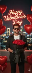 A stylish young Indian man at night on a rooftop with a blurred city skyline full of glowing lights in the background. Red heart-shaped balloons floating around him. He is wearing a red and black dual-tone opened shirt over white t-shirt, black trousers, black leather gloves, and black sunglasses. Holdinga bouquet of fresh red roses wrapped in premium black paper. styled hair, background, a large luxury neon sign saying Happy Valentine's Day' glowing in red and golden light. Cinematic night,