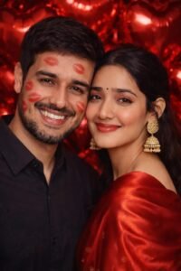 Using my uploaded photo as the main subject reference, recreate this Valentine's Day studio portrait with the same pose, styling, and mood. A close-up couple portrait, both subjects smiling directly at the camera. The couple is embracing closely; the person on the left wearing a dark outfit, the person on the right wearing a glossy red satin fabric draped elegantly around the shoulders. Red lipstick kiss marks visible playfully across the face of the person on the left. Background filled withshiny red heart-shaped balloons creating a bold romantic backdrop. Studio lighting with soft highlights and clean shadows, vibrant red color palette, polished fashion photography style. Photorealistic, high detail, smooth skin tones, cinematic clarity, shallow depth of field, vertical ortrait composition, professional Valentine's photoshoot aestheti