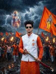 A man stands confidently on a stormy battlefield, wearing a royal saffron kurta with a white Nehru jacket bearing a saffron emblem and dark sunglasses. He holds a sword and a saffron flag with Lord Shri Ramโs image. Behind him, a glowing statue of Lord Shri Ram appears amid dark clouds and lightning, while a crowd with burning torches and Saffron flags marches forward.