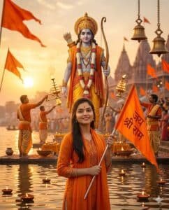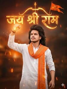 A powerful dynamic portrait of a person in a white kurta and an orange stole raising theirright hand with a fist holding a gowing object Behind them, in the background, long hair and alarge stylized Hindi word (Jay Shri Ram ) is written in fiery glowingletters with a bow and arrow symbol and an orange flag next toit The overallighting is dramatic with warm fiery tones emanating from the gowing elements creating a strong contrast with the darker background.