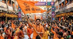 Create a vibrant Ram Navami festival celebration scene where a young Indian man stands proudly in the middle of a grand Ram Navami street procession filled with thousands of devotees celebrating with music, saffron flags, flower petals, and confetti flying through the air. The devotee is joyfully raising a large saffron flag high above his head with โJai Shri Ramโ written boldly on it while smiling with spiritual pride. The street is decorated with long lines of saffron banners, marigold