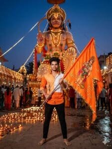Ultrarealistic 8K cinematiฤ orenge shirt . White ankar pents portrait of a stylish Young man, outdoors in front of a majestic, giant Vishal Hanjuman ji statue, during Dip Utsav on 20 October, capturing the statue decorated with glowing diyรกs and festive lighting. Use the uploaded photo exactly- the original face, orenge white printed colour shirt black fit ankar pants, barefoot. He is holding a Kesari Jhanda firmly with both hands, looking toward camera with sharp confiden jay shree ram. ..