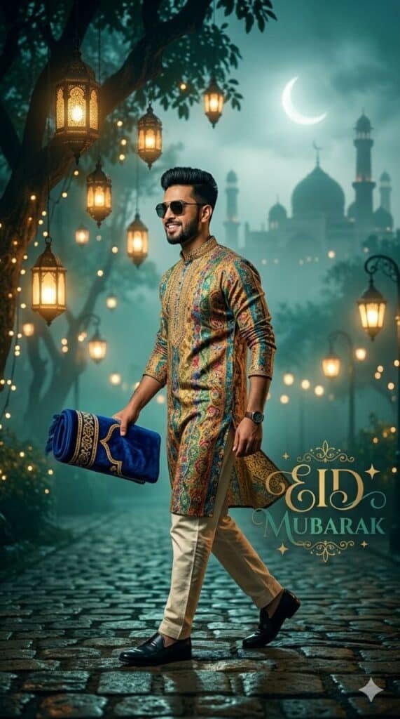 Realistic ultra 12K portrait of a man wearing sunglasses, colorful Punjabi, off-white trousers, black loafers, holding a blue ja-namaz, walking confidently. Misty dreamy background with glowing Eid lanterns, crescent moon, mosque silhouettes, teal & emerald tones. Cinematic lighting, shallow depth of field, professional style, left side angle. Text: “EID MUBARAK” (teal & gold).