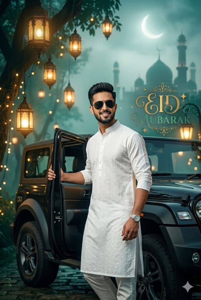 Download ImageHyper realistic 8K photoreal portrait of a confident young Pakistani man standing beside a black Mahindra Thar under festive Eid lights, driver door open. Wearing traditional white kurta pajama, black sunglasses, silver wristwatch. Preserve the exact facial identity from the reference image. Natural skin texture, realistic shadows. Background decorated with glowing Eid lanterns, mosque architecture and golden crescent moon with stylish “Eid Mubarak” calligraphy signAccept ratio 4:6