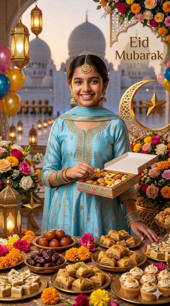 Download ImageUltra-realistic festive 8K portrait of a cheerful young Muslim girl (use uploaded face, 100% match), smiling at camera. Wearing sky blue Anarkali with golden embroidery dupatta gold earrings bangles & maang tikka. Standing beside a luxurious Eid dessert table with mithai dates baklava & cupcakes decorated with lanterns, balloons, flowers & crescent. Holding a sweet box, one hand on table. Warm cinematic lighting, vibrant colors, high detail. Add text: “Eid Mubarak”.