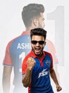 A high-quality sports poster featuring a young South Asian man with quiff-style, wearing rectangular black sunglasses. He is dresed in a (Delhi Capitals DC) ricket jersey. The design uses a powerful double exposure effect: in the foreground, he is captured mid-shout in an intense, triumphant celebration with a clenched fist; in the background, a larger, faded silhouette of him is shown from behind, displaying the name "ASHISH and the jersey number "1". The background is aclean, textured light gray with a large, subtle "1" watermark. Cinematic lighting, dramatic contrast, sharp focus, ultra-detailed 8K resolution, professional sports poster graphic design style, 100% my face same, I need this prompt picture.