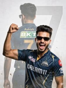 A high-quality sports poster featuring a young South Asian man with quiff-style, wearing rectangular black sunglasses. He is dressed in a (gujarat titans (gt)) new cricket jersey. The design uses a powerful double exposure effect: in the foreground, he is captured mid-shout in an intense, triumphant celebration with a clenched fist; in the background, a larger, faded silhouette of him is shown from behind, displaying the name "Ashish" and the jersey number "7". The background is a clean, textured light gray with a large, subtle "7" watermark. Cinematic lighting, dramatic contrast, sharp focus, ultra-detailed 8K resolution, professional sports poster graphic design style, 100% my face same, I need this prompt picture