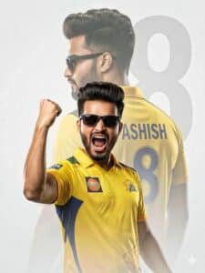A high-quality, professional sports poster featuring a young South Asian man with a stylish pompadour hairstyle and black sunglasses. He is wearing a yellow Chennai Super Kings (CSK) cricket jersey, shouting in celebration with a clenched fist. In the background, there is a large, faded silhouette of the same man from a side profile, wearing a jersey with the name 'ASHISH' and number '8' printed on the back. The background is a clean, textured grey and white gradient with a large number '8' subtly visible. Realistic lighting, cinematic 8k resolution, and sharp details.
