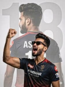 Create a hyper-realistic, cinematic sports poster featuring the SAME young South Asian man (use the uploaded reference image, keep the exact face, hairstyle, beard, skin tone, and facial structure unchanged - 100% identity preservation). He has a sharp quiff-style hairstyle and is wearing rectangular black sunglasses. Outfit: official Royal Challengers Bengalưu (RCB) cricket jersey in deep red and black with authentic team styling and subtle sponsor details. Double exposure composition: Foreground: the man is captured mid-shout in an intense, triumphant celebration pose, with a clenched fist raised, showing raw emotion, energy, and victory expresion. Background: a larger faded silhouette of him from the back, slightly transparent, wearing the same RCB jersey. The back clearly shows the name "ASHSH and jersey number "18" in bold sports typography. Background design: dean, texured ight性y backdrop with alarge subde"18"watermark blended artistieally into the background. Lighting: dramatic cinematic lighting with strong highlights and deep shadows, rim light outlining the subject, high contrast for a heroic look. Style: ultra-realistic, sharp focus, depth of field, professional sports poster design, high-end graphic Composition. Details: sweat texture on face, ultra-detailed skin, fabric realism on jersey, slight motion blur on fist for action feel. Quality: 8K resolution, HDR, ultra-detailed, crisp edges, poster-ready finish. Important: do not alter the face it must match exactly with the uploaded image.